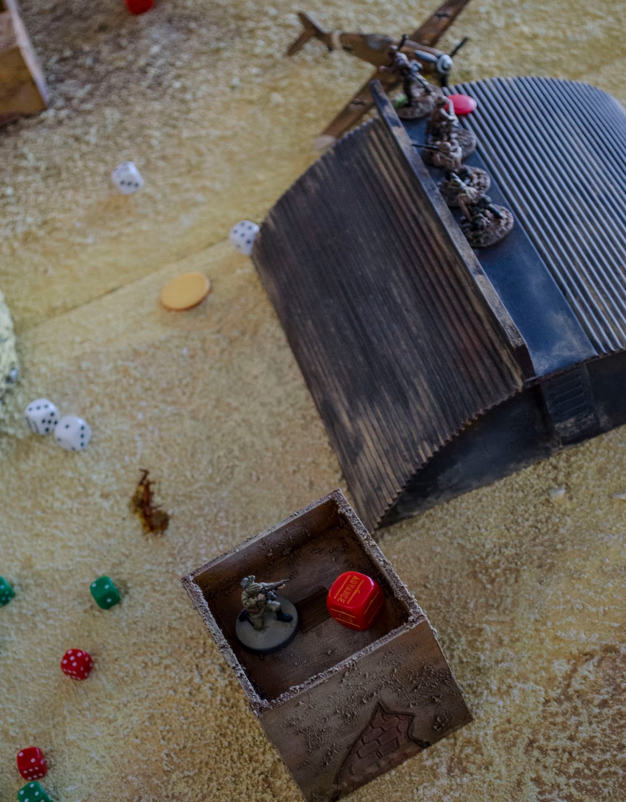 W drugiej bitwie walczyłem z okopanymi amerykanami. Mimo początkowej inicjatywy po stronie DAK, którzy szturmem wzięli wschodnią część miasta była to sromotna klęska. Po zachodniej stronie atakujący oddział został spinowany, a snajper przez całą grę nie trafił nikogo :-) Dodatkowo mój Pz III zaraz po wejściu na stół został zdjęty przez pierwszy szczęśliwy strzał Shermana.